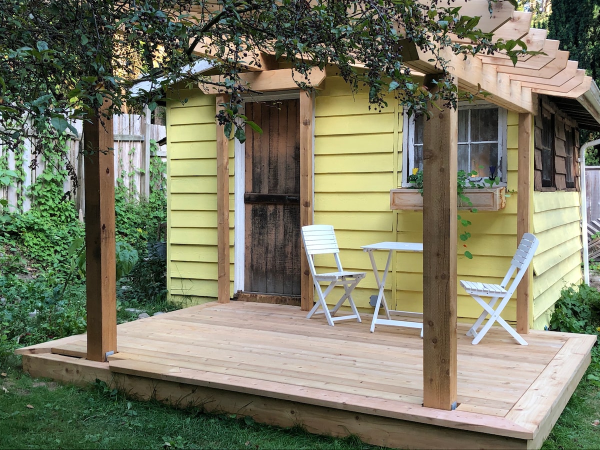 Welcome to our cozy cabin. Birds are chirping and the cabin is cozy.. Slow down with a restorative comforting cabin retreat. Walkable to Bowen Artisan shopping. We are a quick scenic stroll to local restaurants, art galleries and coffee shops, via woodland paths or coastline paths. Our econonic cabin SHARES A BATHROOM with main house. A short walk to both the beach or the Bowen Island cove with coffee shops, restaurants, and grocery. Wake up to a cozy cup of fresh coffee or tea