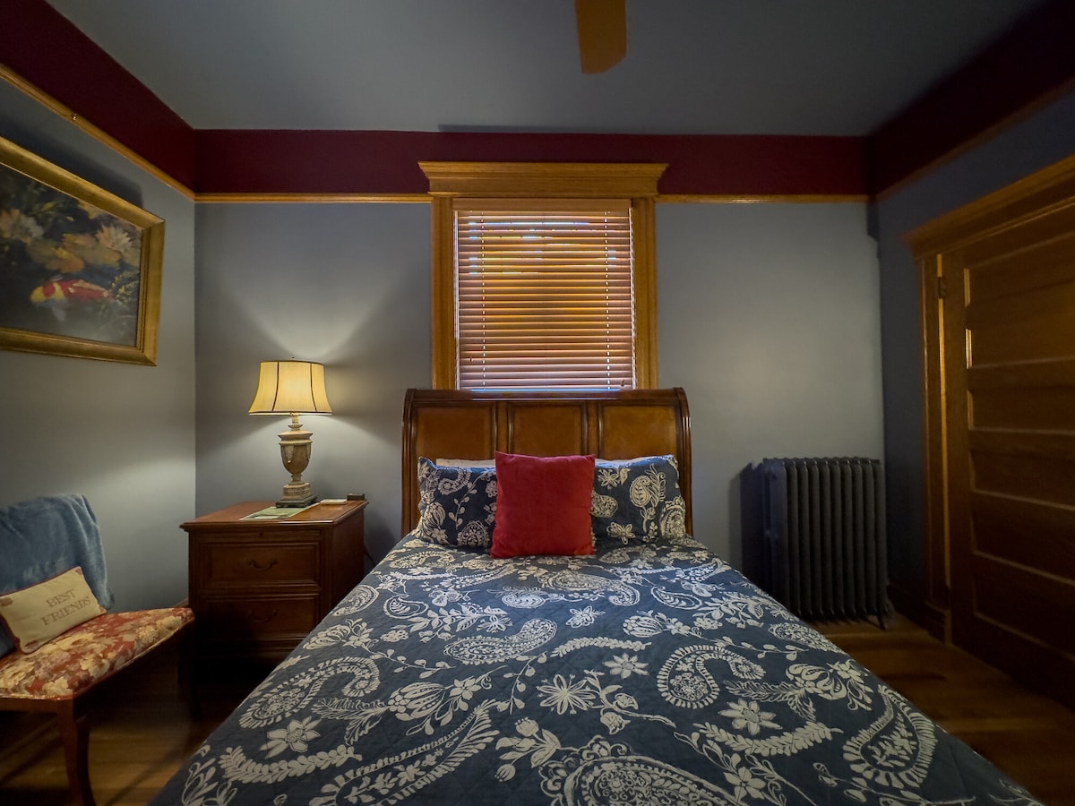 This elegant room is on our main floor featuring the original stained glass windows. Great mattress with memory foam topper. High Ceiling, ceiling fan, TV-expanded cable. Lightning fast wireless Internet. The bathroom is detached and private with a Japanese soaking tub for a deep bath or hand held shower. The top of the tub is at the floor level. Full building air filtration, UV lights on our HVAC for supply air, Full building water filtration.