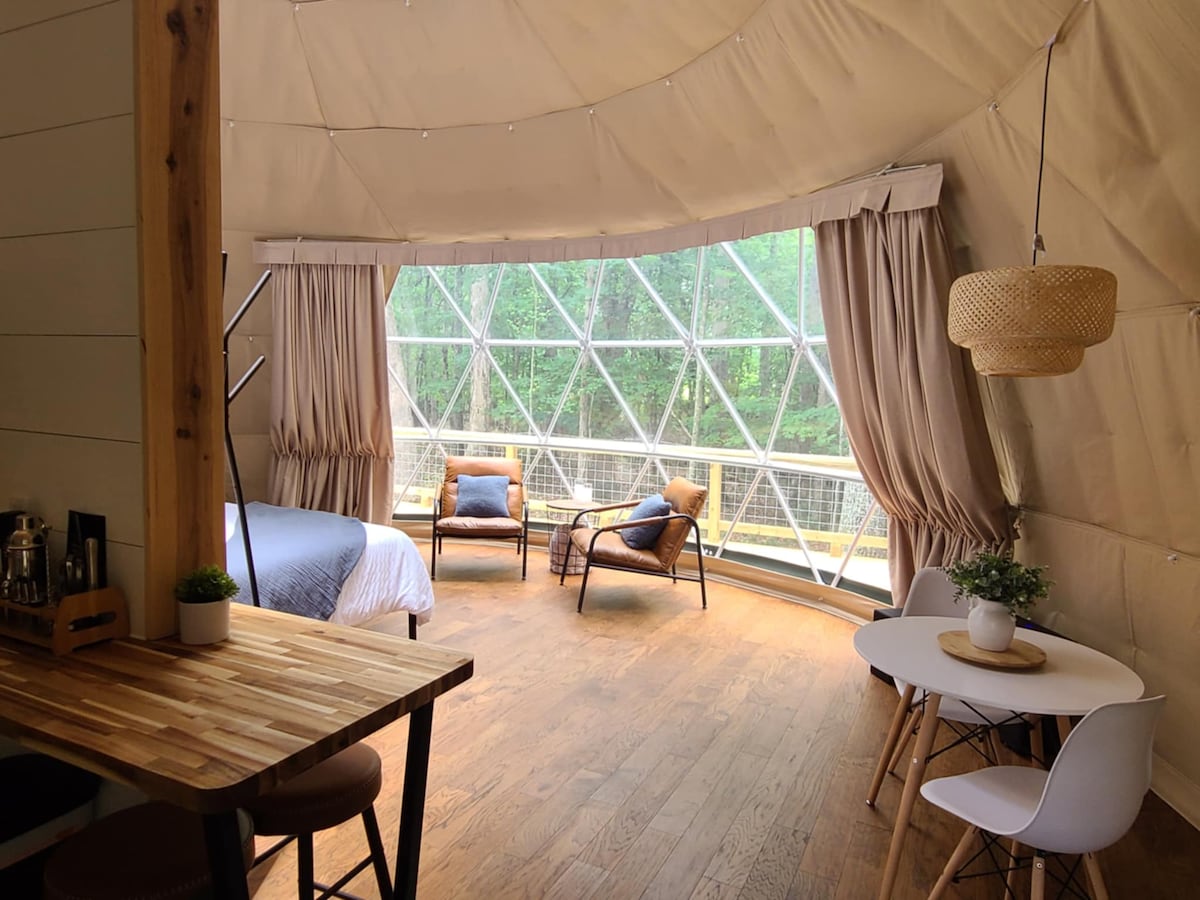 Nestled in the heart of the New River Gorge National Park you will find our luxury glamping dome. A couple's retreat designed to help you unwind and reconnect with your special partner awaits. Make smores at the pondside fire pit, soak in the hot tub, enjoy abundant wildlife on the property, head out for a hike, or just nestle in bed and gaze at the stars through the skylight. We have a strict NO CHILDREN, NO PETS policy due to the fragility of the dome and to help you focus on your loved one!