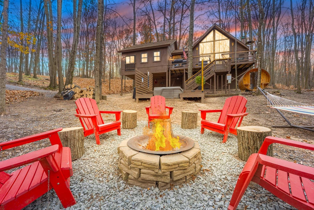Experience the epitome of luxury in our breathtaking A-frame cabin, nestled amidst the serene woods. This modern retreat offers lavish amenities and a stunning open living space with floor-to-ceiling windows, immersing you in nature's beauty. Indulge in the private hot tub, relax by the fire pit, and unleash your culinary skills in our fully equipped kitchen. The large screened porch provides a tranquil oasis, while nearby hiking trails, golf courses, and a spa offer an unforgettable getaway!