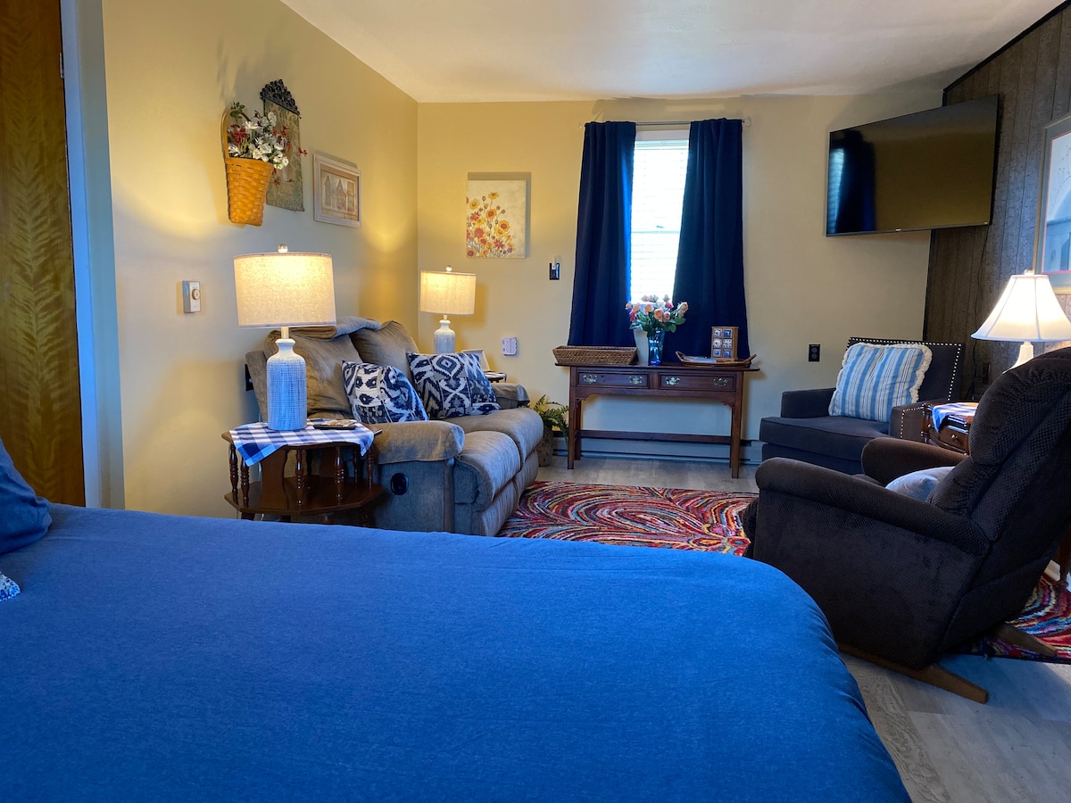 Lavender Hill Roost beach themed unit features a large bedroom with a balcony, bathroom with a stand up shower, large living room furnished with a twin bedroom suite and a private guest entrance. It also includes a kitchenette and an on-site shop with many convenience foods, beverages and products. The property is on 13 acres to hike and enjoy, including firepits, a swingset & a larger shop featuring many locals products. It is close to the New River Gorge National Park.