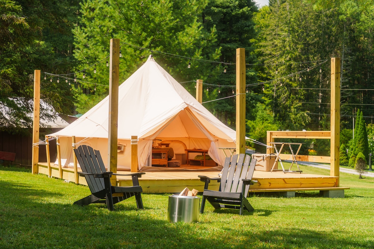Camping with a touch of creature comfort = Glamping. This is a canvas safari tent with a woodstove and comfortable bed for two. Situated overlooking our 3-acre stocked fishing' pond with easy access to our bathhouse, hiking trail entrance, and camp store. Linens are provided. It is not 100% bug or critter proof, so please don't leave food or trash out. Amenities include solar powered lights, and charging station. Come stay on the hill and watch the fish jump.
