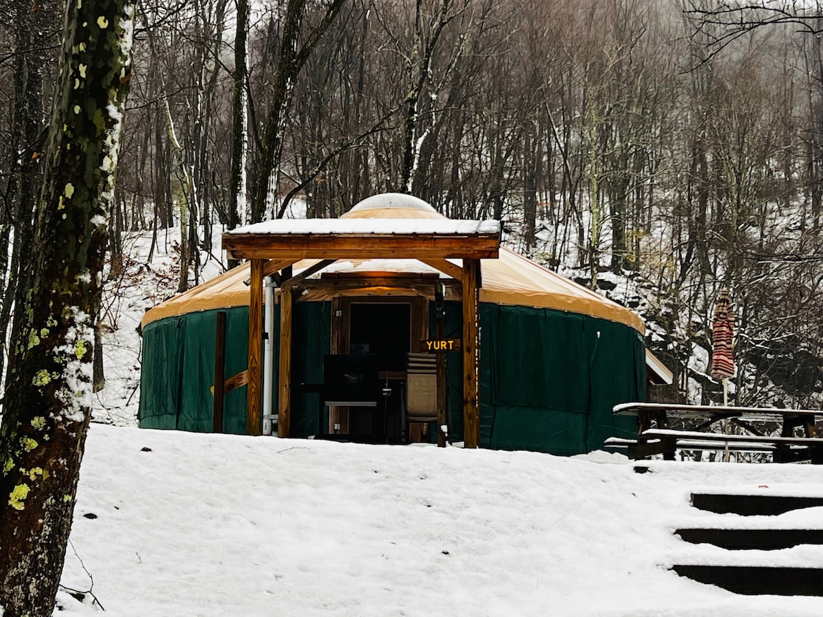 This new 30' Yurt is situated perfectly, right on Potts Creek. The mountains have always been a magnet for the free spirit of a gypsy soul. If thats you, come escape into the solitude of the Feathered Fern Yurt! A fun - colorful Boho theme, you'll be surrounded by soft textures and luxuries not found in such a setting as this. Find yourself in the warmth of a large Slipper Tub peering out the window over the babbling stream. Peace & solitude you will find here.