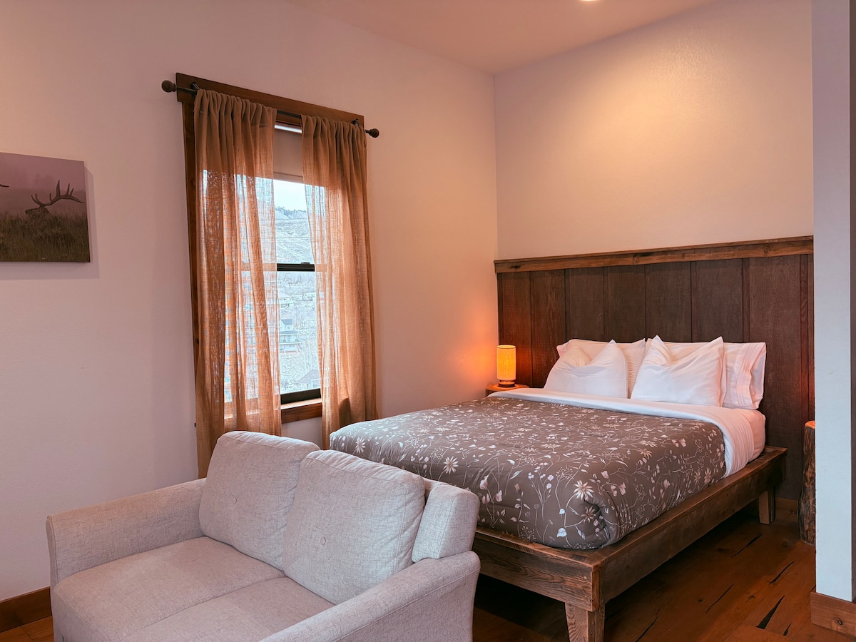 Only 1 block to Yellowstone Parks North entrance Warm and cozy 20 ft x 30 ft accommodation. Two Queen log beds , comfy seating area with TV screen to hook up to your Netflix or Hulu account. **Long log table for eating and viewing the peek- a- boo river view. The kitchen has everything that you need to prepare a meal and serve it. **Microwave also available if you just want to relax and reheat.