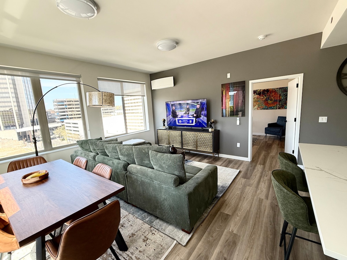 Surround yourself with style, comfort, and sunlight. Conveniently located downtown, offering beautiful city views creating nothing but good vibes wether you are working or visiting. The apartment is light and bright during the days, and very cozy and quaint in the evenings. Comfortably sleeps 4 adults. Walking distance to shopping, theaters, restaurants, parks. Wi-Fi, reserved covered parking, workout facility and laundry room, safe friendly front desk