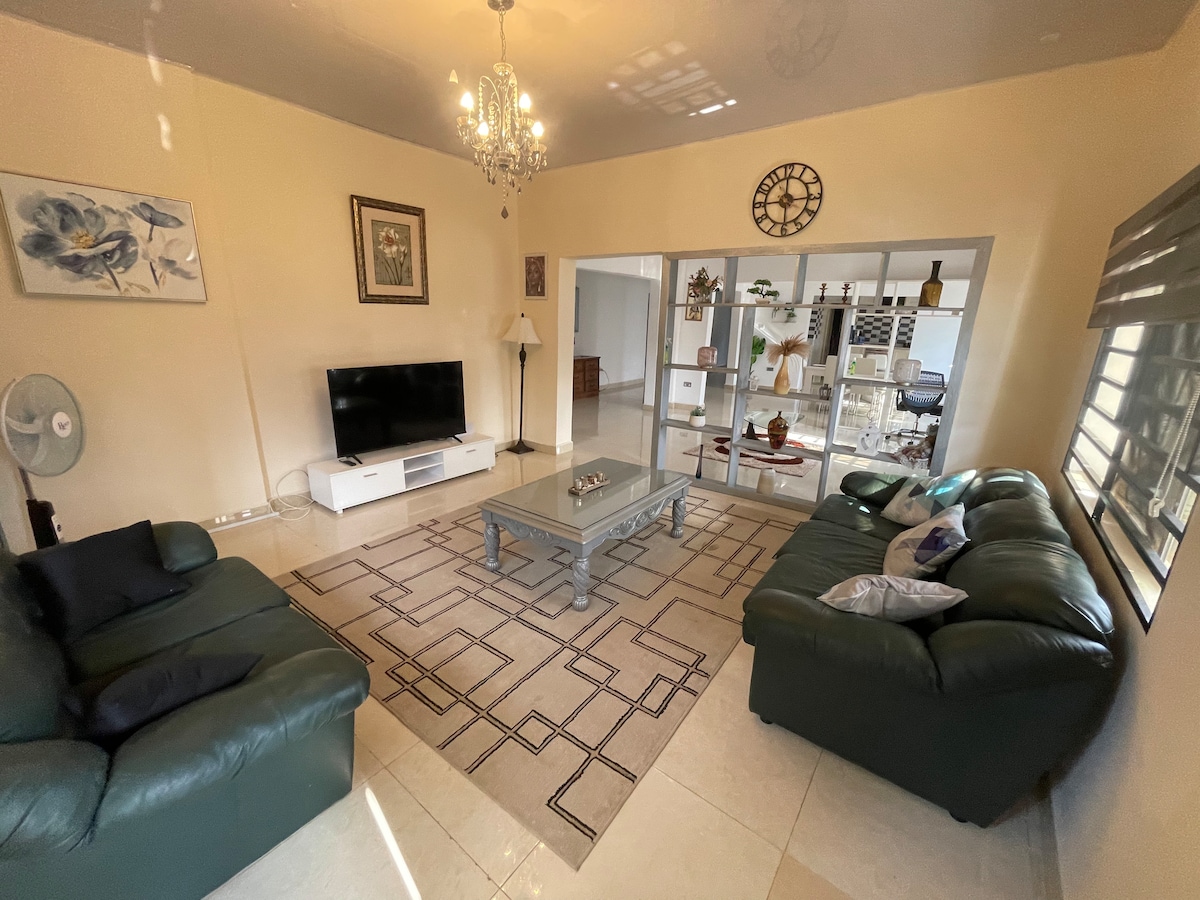 Forget your worries in this spacious and serene space. Tastefully decorated and fully furnished modern 3 bed house with scenic mountains views Perfect for: Remote workers, expats, travelers, and business visitors. Wi-Fi Guest Toilet AC Utensils Solar power Spacious parking Security guard CCTV Electricity Please note that Havillah Court is located the top of a steep hill but is accessible via a paved road from the main highway. You need a good car that can climb hills.