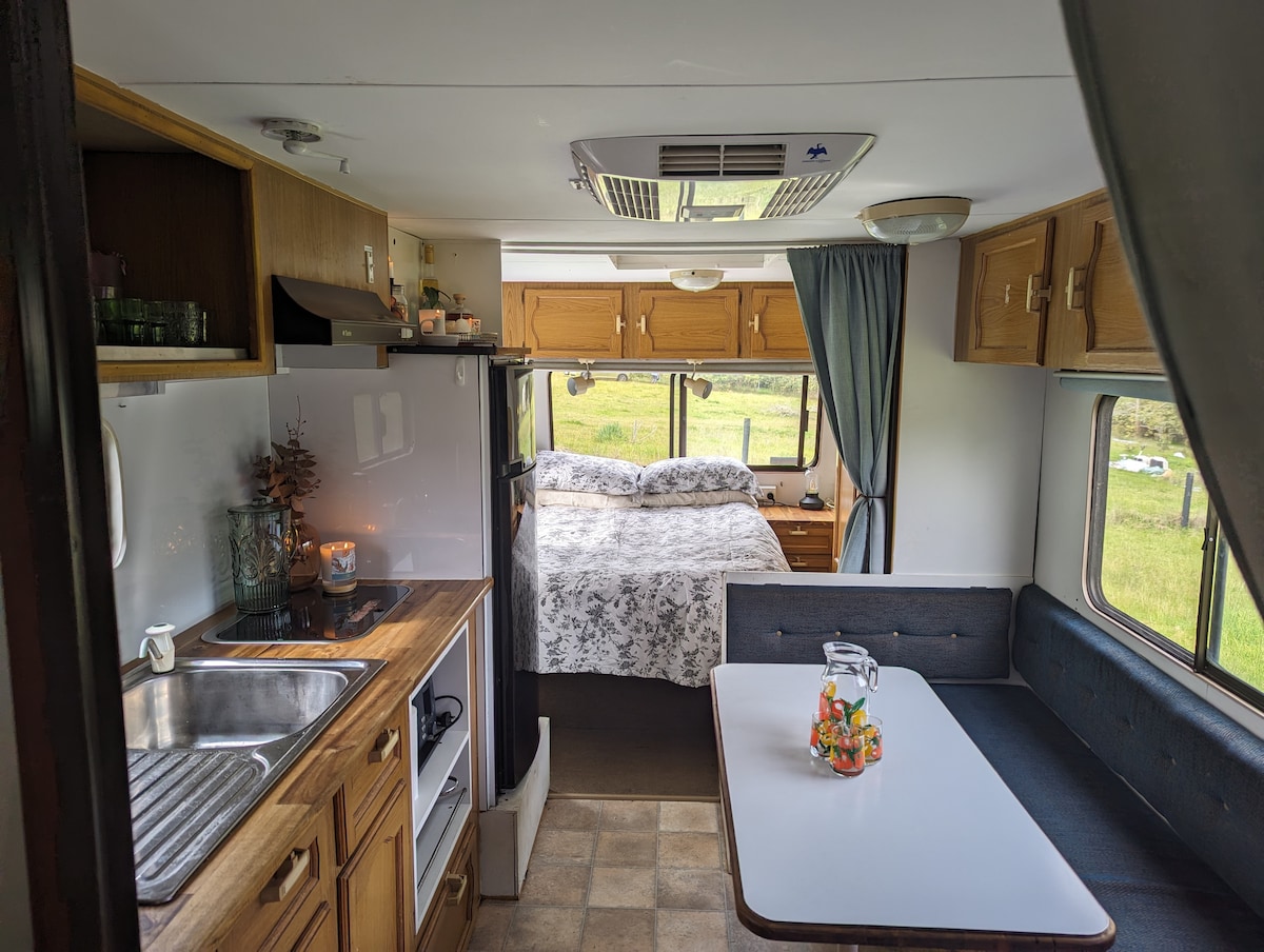 This place is pretty special! A lovingly restored school bus now spends its time nestled amongst gum trees. You'll soak up the warmth of the morning sun, whilst listening to the bird life, and watching sheep, cows and kangaroos in neighbouring paddocks. The privacy and tranquility will allow you make yourselves at home. Whether you’re reading in a hammock, drinking wine watching the sunset, soaking in a spa, playing boardgames, or cooking on the Weber. Not suitable for children or pets.