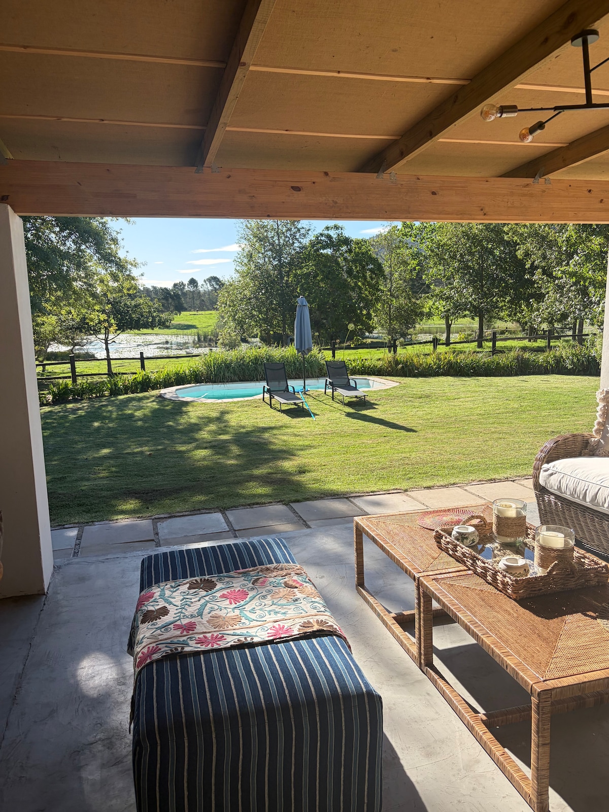 The Dairy is literally an old milking parlour which has been turned into spacious accommodation on this working dairy farm. The unit has a more modern feel to it than the Farmhouse. Lovely views of the dam & Outeniqua mountains and a big "farm pool" with deck. Wood-fired hot tub on a wooden deck on the patio.