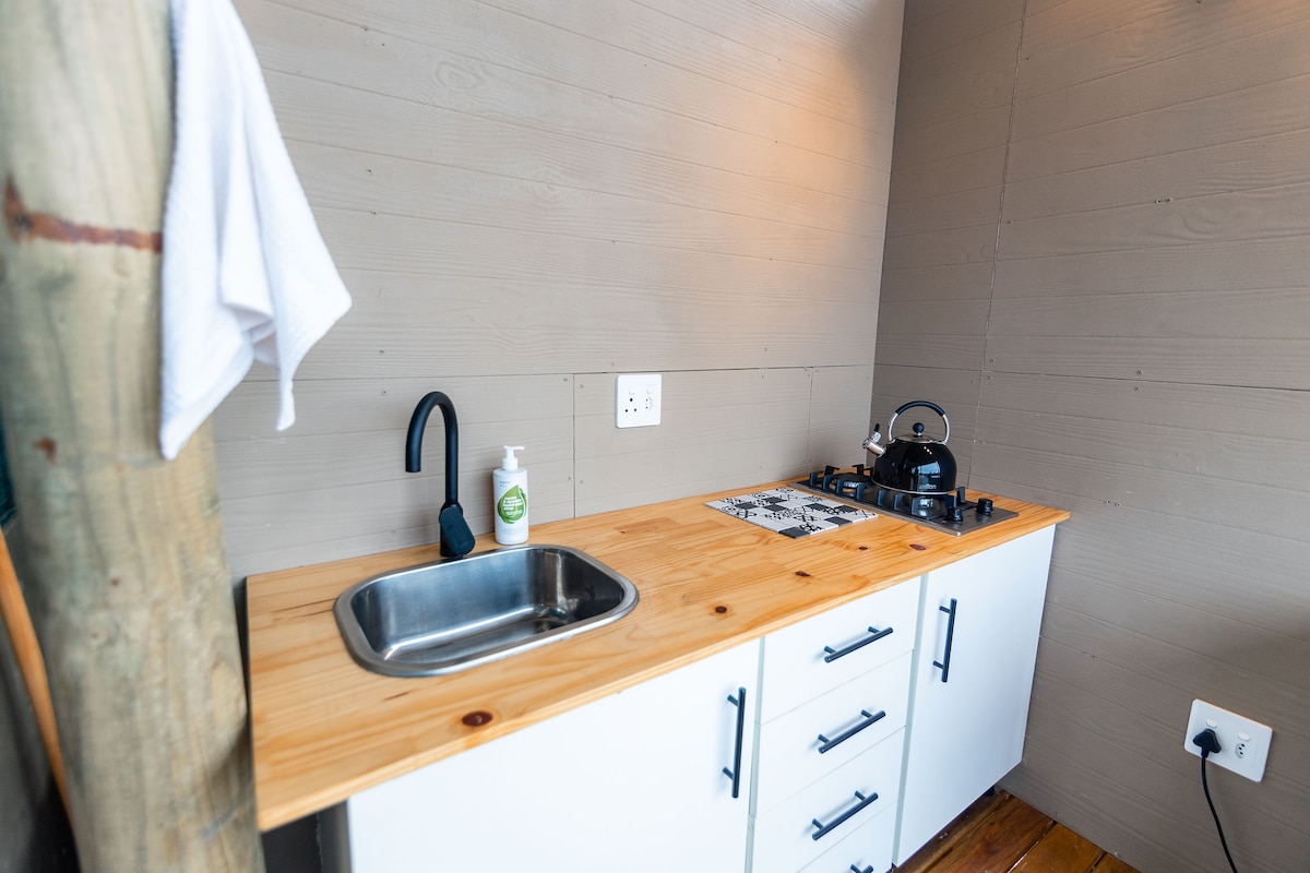 Enjoy the serene setting of this romantic getaway, nestled in nature—just 7km from the charming town of Montagu in the Little Karoo. The tent offers an off-the-grid experience, yet you’ll still have cellular reception and all the comforts of luxury. The tent is equipped with electric plugs & a range of small appliances: kettle, induction plate, microwave, toaster & an air-conditioning unit with hot & cold settings. The unit accommodates 2 guests with a queen-size bed.
