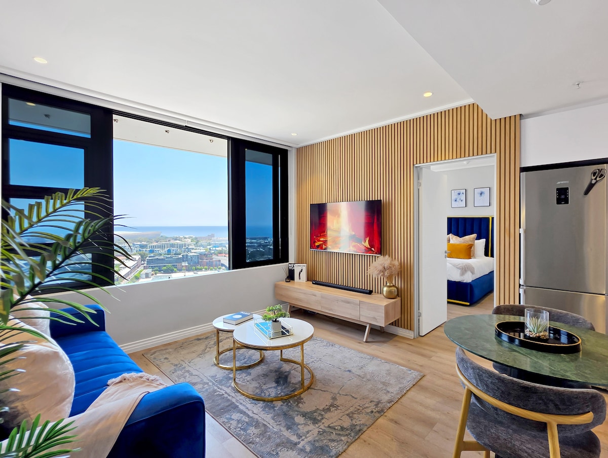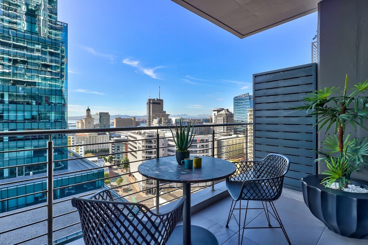 Experience the best in technology and luxury comforts in our purpose-built, Work-from-Travel, video conferencing studio. Located in trendy Breë Street on the 21st floor of Cape Town's tallest residential building, this apartment will provide everything the modern-day global citizen needs. Let's start with the breathtaking ocean and city views. Add to that, everything you need to work. Height adjustable desk, 200mbps Internet line, Backup Power solution and even video lighting.