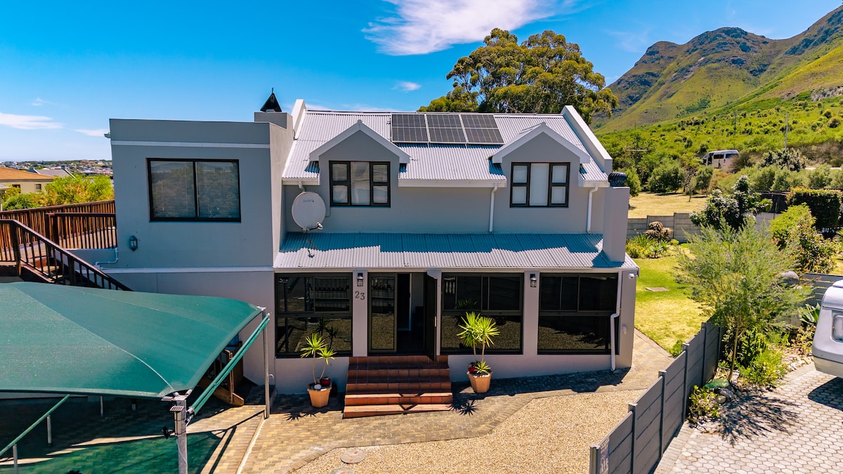 Escape to our luxury coastal getaway in Struisbaai. Just a 5min walk from the pristine white sand Struisbaai beach, this 7-bedroom property combines traditional Cape Dutch architecture with modern amenities, and welcomes you with a thoughtfully packed welcome hamper of goodies. Awaken to crisp beach breezes and the tranquility of a private estate. After a day of exploring, unwind in the games room and cinema loft, then fire up a traditional South African braai under the pergola area.