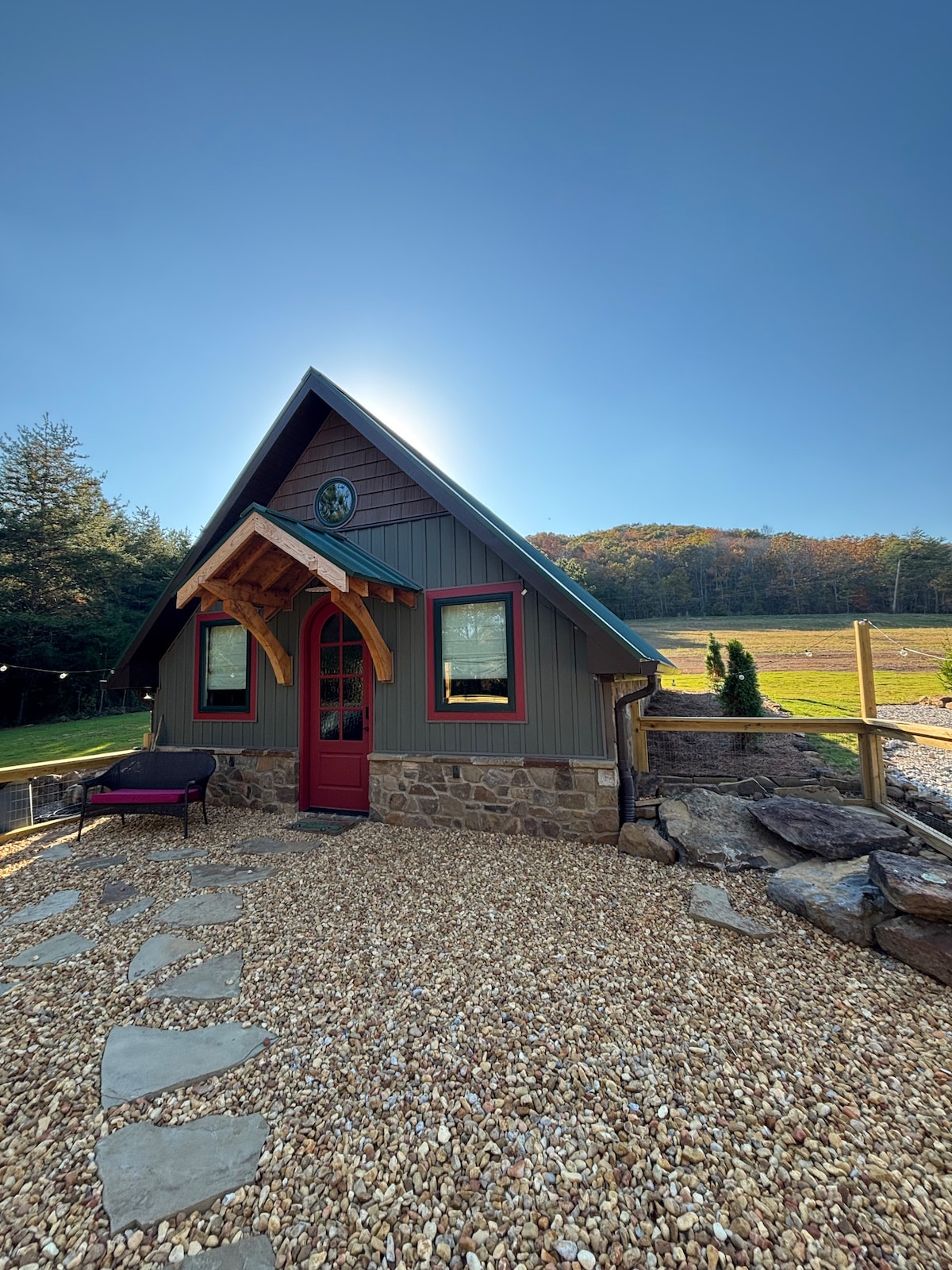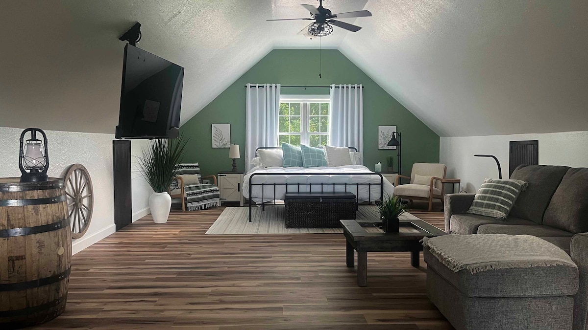 Welcome to Red Country Retreat, a peaceful escape tucked into the corner of our shop, right at the edge of the woods! Wakeup to cows grazing in the pasture, chickens happily cackling in the distance and the kind of quiet you can only find in the country. Inside, enjoy warm cabin vibes with rustic charm and a cozy electric fireplace-the perfect place to slow down and unwind! Whether your looking for a weekend reset or a country getaway, Red Country Retreat offers simple living at its finest!