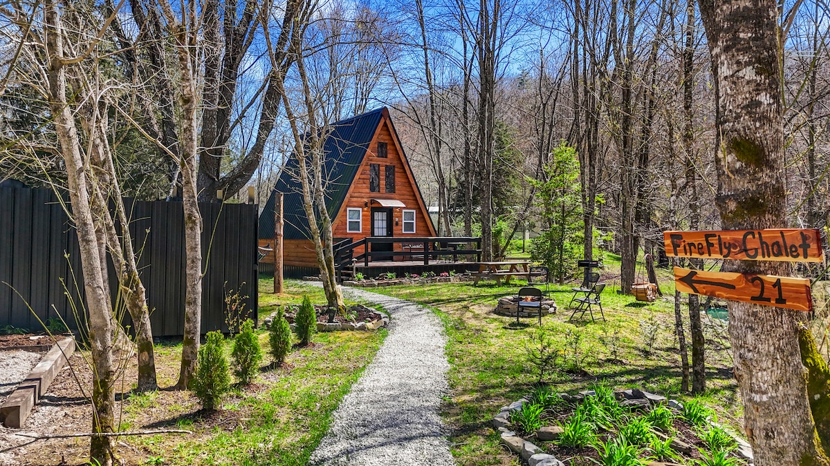Firefly Chalet – A Cozy Woodland Escape by the Water Firefly Chalet is a perfect peaceful getaway—where rustic charm meets natural beauty. This cozy A-frame welcomes you with wood interiors, a scenic wooded setting, and everything you need to unwind. Step outside and follow the winding gravel path to your retreat, surrounded by towering trees and fresh mountain air. Start your mornings on the deck with a cup of coffee, and spend your evenings gathered around the fire pit under the stars.