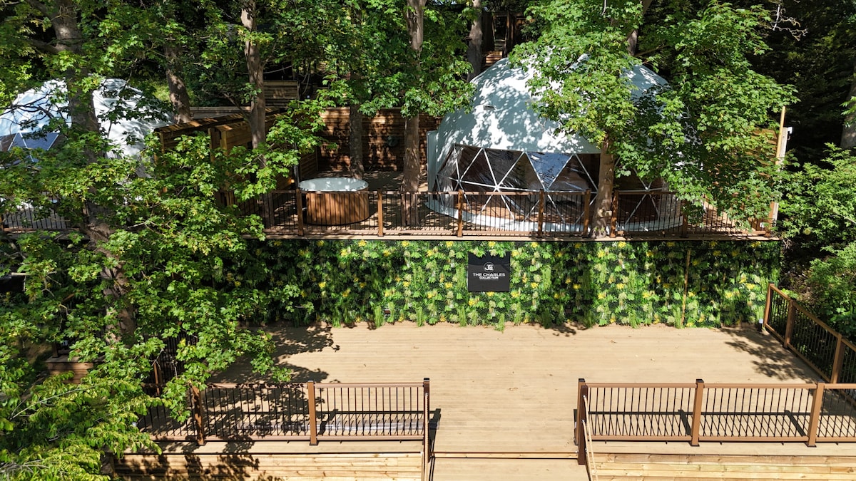 Escape to elevated luxury at The Charles Dome – a light-filled treetop retreat designed for magical moments in nature. Whether you're soaking in the wood-fired hot tub, watching a movie from the loft bed, or dining beneath the forest canopy, every detail invites comfort, connection, and calm. Key Features: Private Wood-Fired Hot Tub & Shared Sauna Cinema Projector Viewable from Loft Bed Indoor & Outdoor Dining Spaces Designer Kitchenette & Rainfall Shower Sleeps up to 5 Guests
