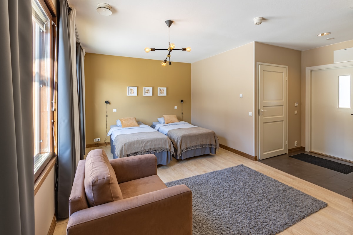 This one-bedroom apartment has a kitchen equipped with hotplates, cupboards, combination oven, coffee and water kettle and crockery. A stylish bathroom with shower and hair dryer brings comfort to your stay. In addition, the room also has its own washing machine. Four single beds guarantee relaxing sleep for two people. The room price includes Wi-Fi and towels and bed linen.