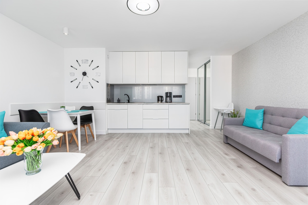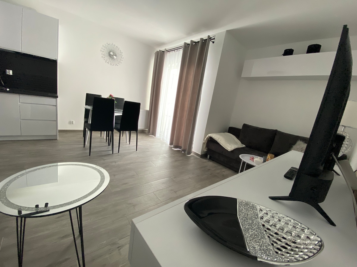 Zapraszamy do luksusowego apartamentu który łączy w sobie nowoczesność i klasyczną elegancję. Przestronny salon z aneksem kuchennym urządzony jest z dbałoscią o każdy detal. Jasne kolory i eleganckie meble tworzą wyjatkową atmosferę relaksu i komfortu. Znajdziesz tu wszystko czego potrzebujesz od płyty indukcyjnej przez piekarnik pralkę aż po zmywarkę. Przytulna sypialnia z łożem małżeńskim zapewni komfortowy sen. Gustownym uzupełnieniem apartamentu jest nowoczesna i funkcjonalna łazienka