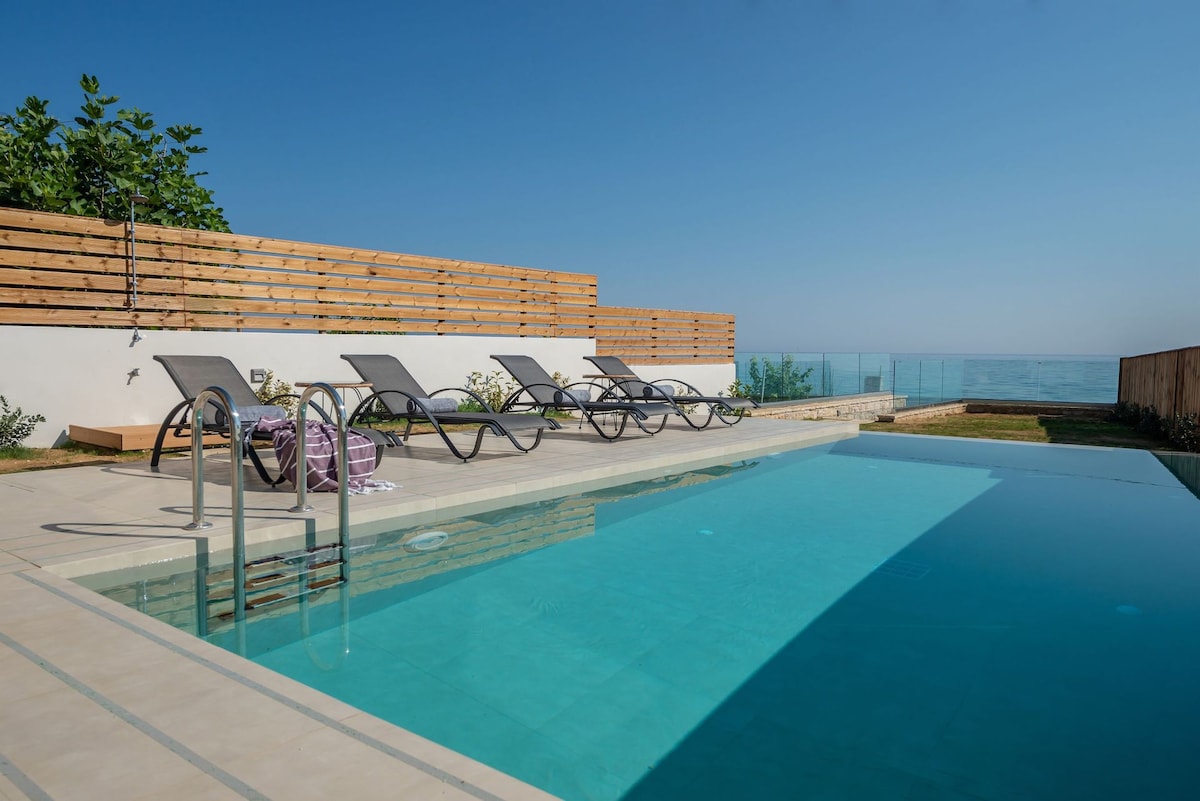 Beachfront three-bedroom retreat with a private swimming pool, sea-view verandas and direct outdoor living. Ideal for families or friends, with en-suite bedrooms, BBQ dining and modern comforts throughout. Located on Psarou Beach in Ammoudi, with easy access to local tavernas and coastal spots. Sleeps up to 6.