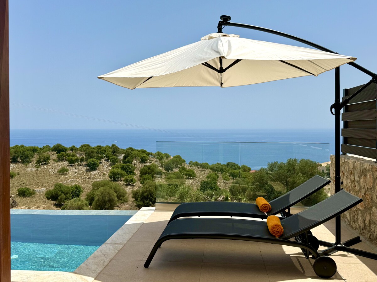 Sandy Pines Villas: Athina Beachfront Villa. A private retreat where pine trees meet the Ionian Sea. Athina Villa (82m²) offers the rare luxury of a private gate leading directly onto Alykes Beach. No roads to cross, no shoes required. Ideal for families seeking authentic luxury. Enjoy your morning coffee with the sound of waves, a private garden, and village tavernas just a 5-minute stroll away.