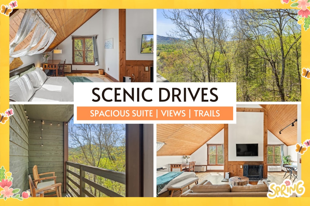 ★ “Twilight Ridge was the most peaceful place I’ve stayed. We watched the stars through the skylights and had coffee on the balcony—it was perfect.” ★ Twilight Ridge is your personal pocket of peace in the Smoky Mountains. This spacious suite blends mountain charm with modern comfort—skylights above the bed, a cozy sofa nook, and a private balcony with forest views—plus complimentary breakfast each morning.