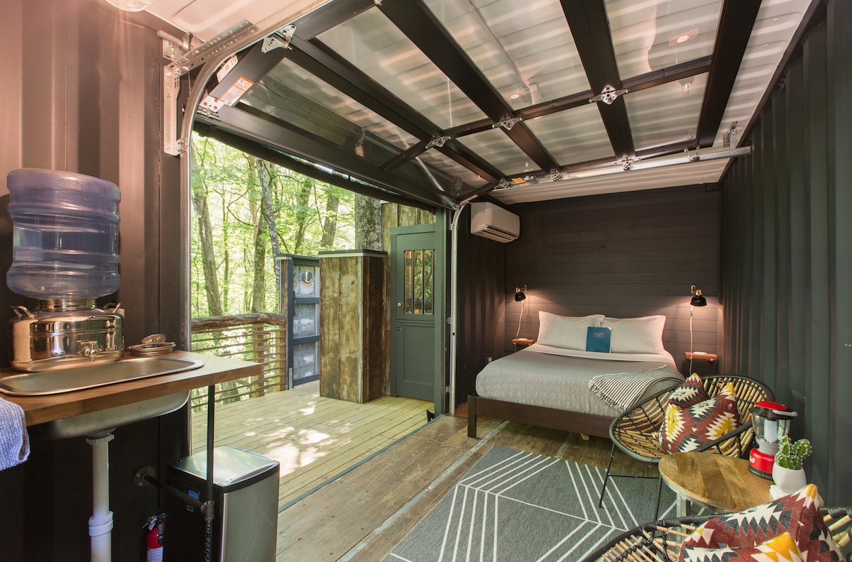 *4x4 or AWD only* This modern, dog friendly retreat is a converted shipping container situated on our 125 acre mountain top forestry management land that backs up to Pisgah National Forest. Enjoy all the best hikes on the Blue Ridge Parkway just 4 miles away and then head 25 minutes into Asheville for all its amazing food, music, and beer. We provide the luxury of electricity, heat and air conditioning, with a little taste of being off grid with an outhouse and an outdoor solar shower bag.