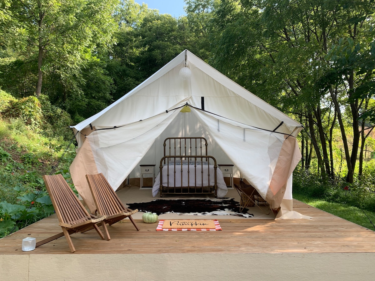 A romantic and luxurious canvas resort tent with a private hot tub, bathroom and fire pit located minutes from downtown Asheville and the Blue Ridge Parkway. Enjoy the comforts of high count cotton linens, Turkish bath towels and a king size mattress in a wooded setting located in the heartbeat of Asheville. Cook full meals in a well appointed kitchen (breakfast foods provided!). The glamping site is located within 10-15 minutes of ALL the amenities Asheville offers.