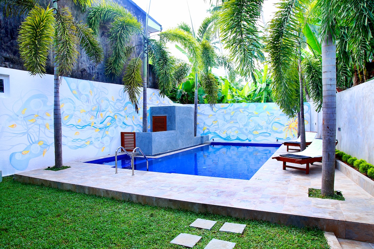 Tourist board and Safe and Secure certification for covid-19. Sitiuated 150m from the ocean in a serene and private area. We provide AC, Hot Water, Pantry, Gas, BBQ, Washing Machine, Fridge, Private Pool & jacuzzi, Air Port Pickup & Drop will be charged @ cheap rate . (Note : you can use Garden & entire upstair). 6km to Bentota / Madu River. 45 min to Hikkaduwa, Galle Fort & Unawatuna,Water sports, turtle farms etc are close. Breakfast not provided unless especially requested ($5each).
