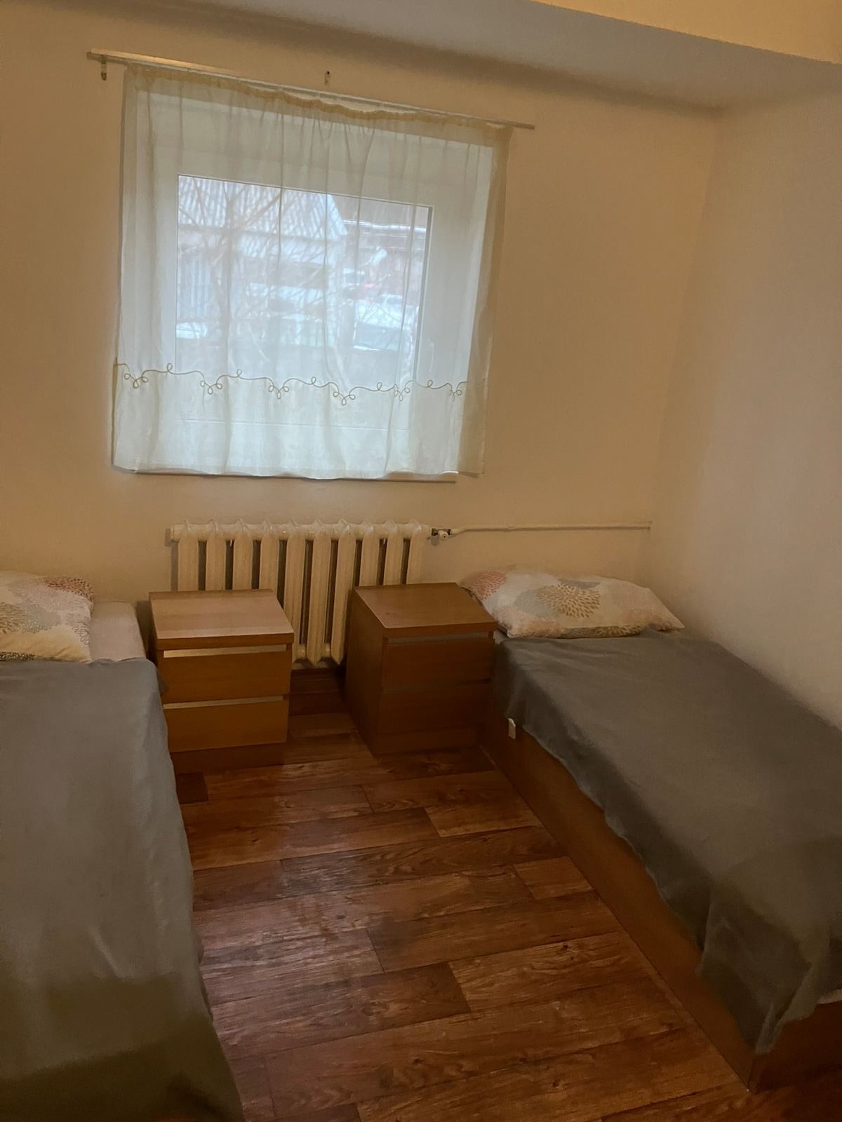 Diese Wohneinheit befindet sich im Souterrain. Zimmer mit 2 Schlafzimmern: 1 Raum mit Doppelbett 1 Raum mit Einzelbett Ein eigenes Bad mit WC befindet sich separat gleich gegenüber des Zimmers. Ebenfalls eine Tür weiter befindet sich die große Gemeinschaftsküche mit Esstischen, Waschmaschine und allen Küchengeräten.