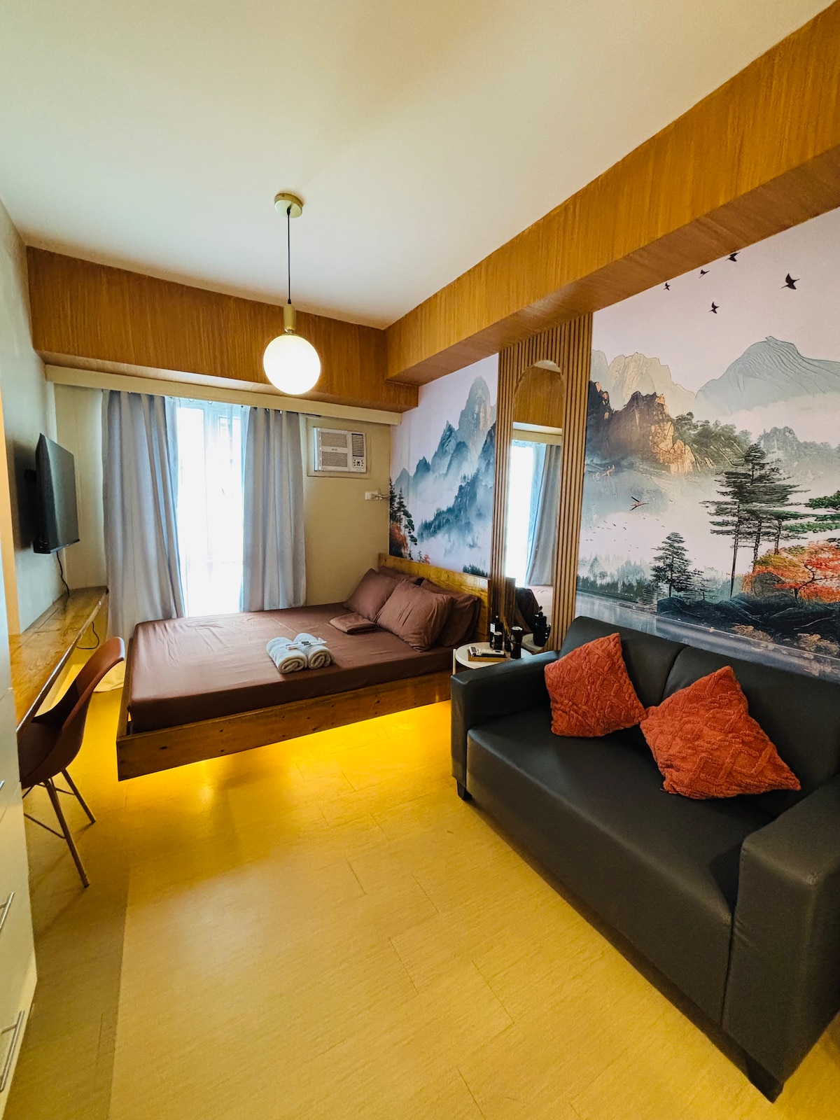 Perched on the 16th floor, this cozy studio offers sweeping views of Bacolod’s skyline and sea. Wake to golden light streaming through the window, unwind under a chandelier of stars, and rest in soft linens. A warm wood desk invites work or journaling. Perfect for solo travelers or couples seeking serenity above the city—compact, calm, and unforgettable.