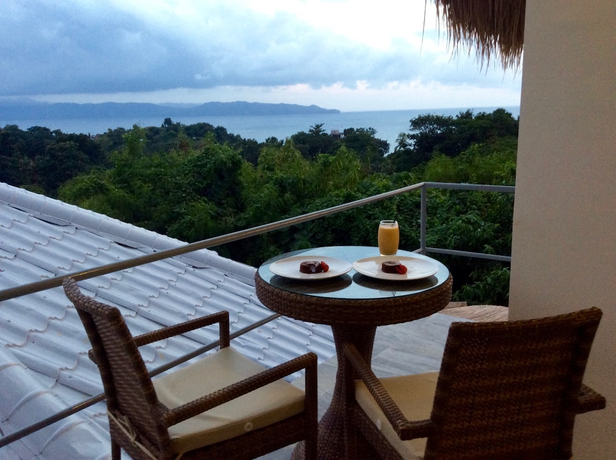 On 2nd Floor, your private studio with bathroom and queen size bed, open kitchen, nice sea and sunset views. On 3rd Floor, your private Rooftop with fantastic 360° views of Boracay and a bathtub. It's located on a hilltop above Shangri La and crimson There is a 35 meters access road that is quite steep Our place is perfect for couples who want privacy, in a quiet area. If you're a party person, rather look for places closer to white beach where all the bars are Fast internet (fiber optic 50Mbps)