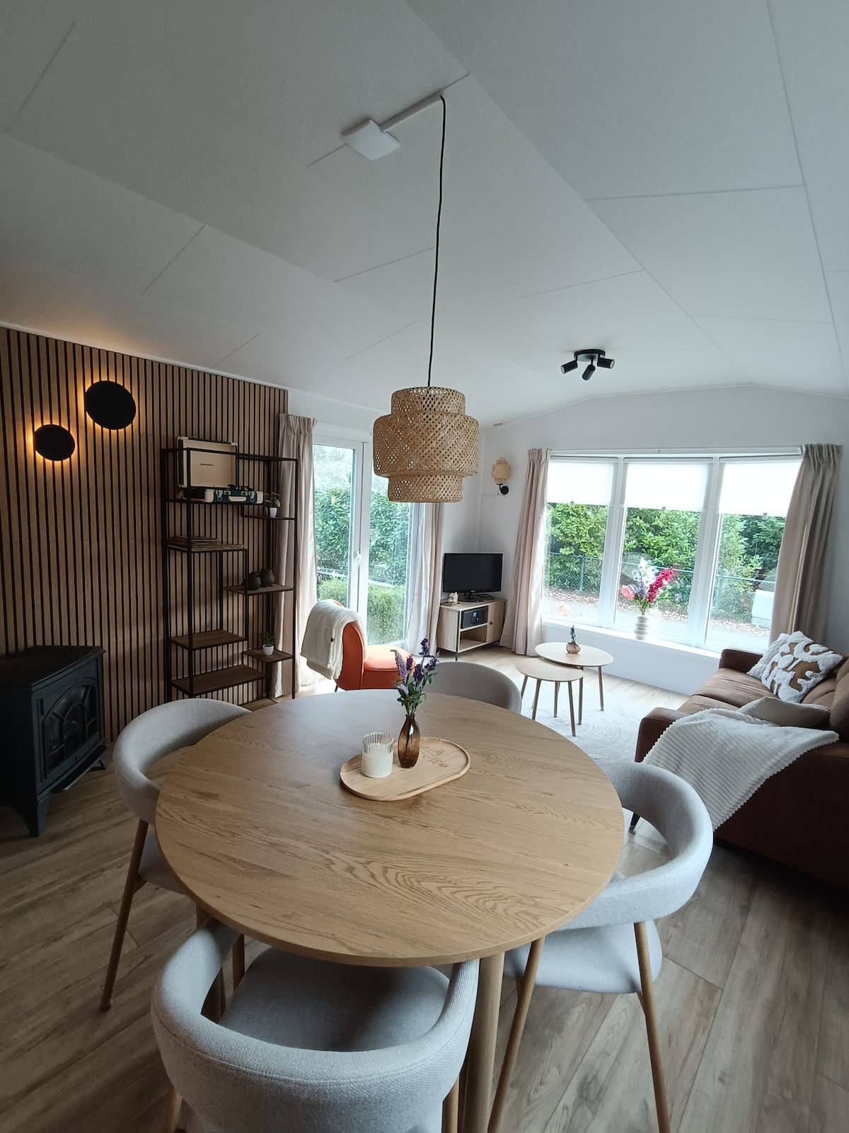 Escape the rush and unwind in nature. The Naturelodge is warmly styled and offers a direct connection to the outdoors through large windows. Feel the warmth of fire: in the hottub, by the fire pit, or cozy by the wood stove. At night, gaze at stars and moon from your bed through the roof window. Spacious natural garden with views over the heath of National Park Dwingelderveld. Large terrace with hottub, hammocks, and outdoor shower.