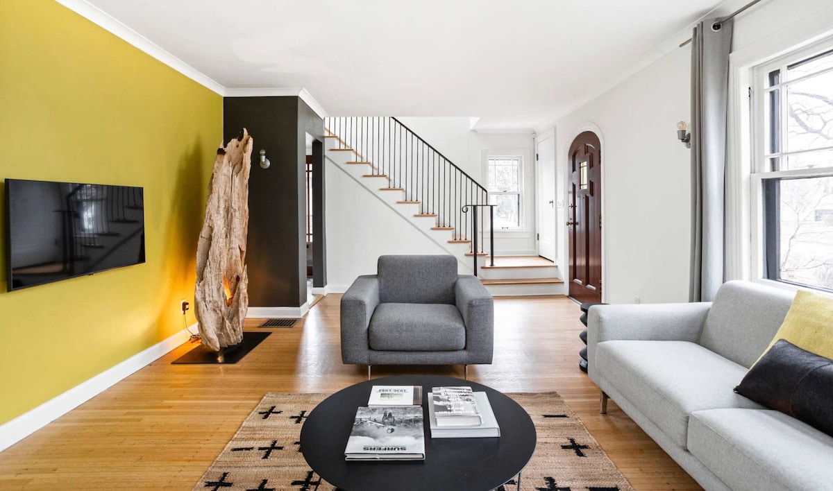 This reimagined century-old property features a gas fireplace with wood-panel surround, home office workspace, tiled bathrooms, hardwood flooring, and plenty of space to relax. Cook in a refurbished kitchen of quartz countertops and stainless-steel appliances, and truly find yourself at home away from home. This property includes 2 bedrooms: 1 king, 1 queen. Parking is available on the street, with no extra cost or pass required.