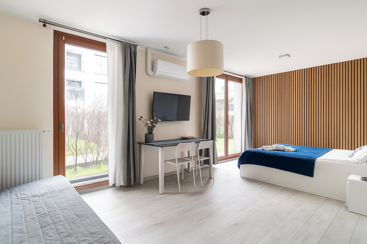 Komfortowy, w pełni wyposażony apartament w nowym budynku. Salon z otwartą kuchnią podzielony na część jadalną i wypoczynkową. W sypialni znajduje się duże łóżko i przestronna szafa. Jest także garderoba jako dodatkowe miejsce do przechowywania. W okolicy znajdują się sklepy, restauracje i kawiarnie Wyposażenie: klimatyzacja, ekspres, czajnik, żelazko, deska do prasowania, pralka Dojazd z Lotniska Chopina 20 min taxi 50 min komunikacja z Lotniska Modlin 50 min taxi 120 min komunikacja