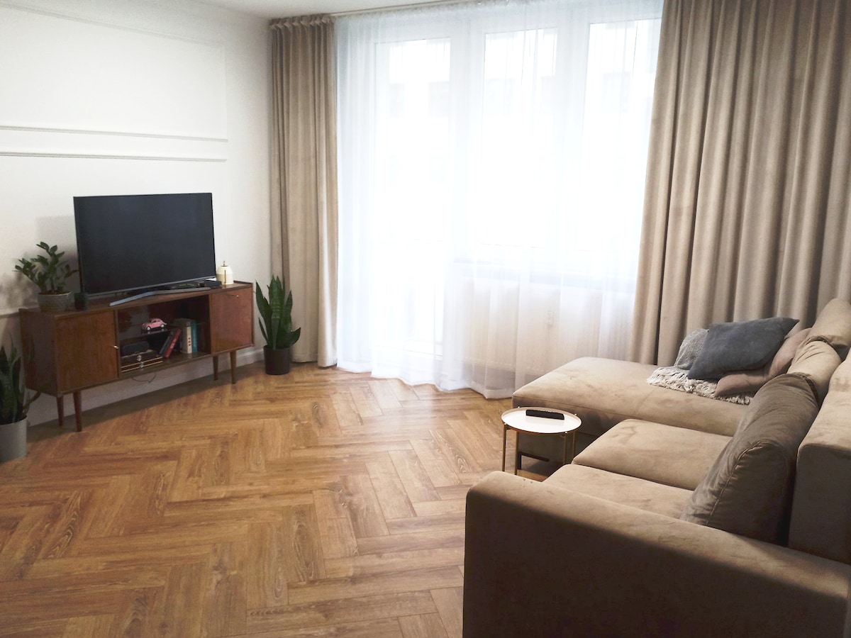 Convenient check-in and location (close to the metro, tram) will allow you to quickly enjoy the comforts of this stylish, 2-room apartment. ✔ Balcony ✔ Double bed ✔ Fast internet ✔ Desk ✔ Monitor ✔ Dishwasher ✔ Fridge + freezer ✔ Wine fridge ✔ Oven ✔ Gas stove ✔ Washing machine ✔ Vacuum cleaner Do you like a bright and large apartment in a quiet neighborhood? You will feel very comfortable here! Both working remotely, relaxing or going to the park. P.S. It's my home when I don't travel.
