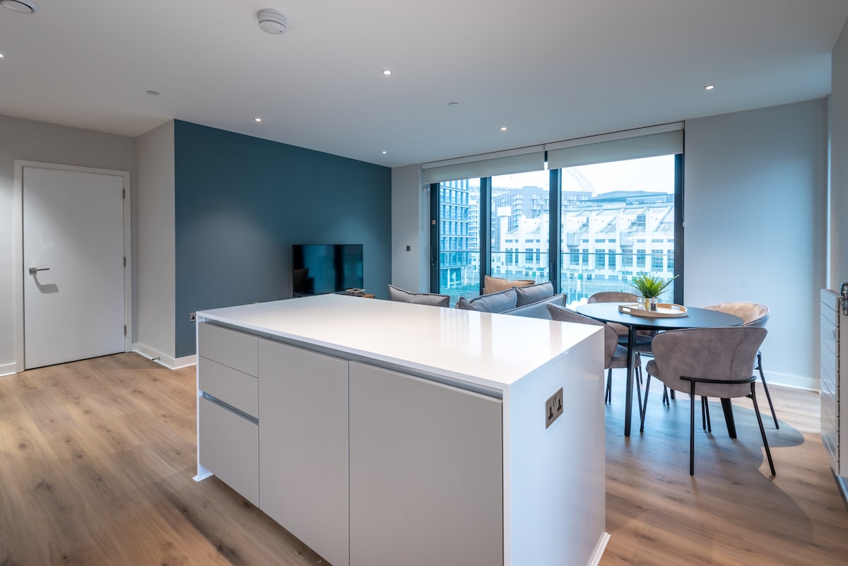 Experience refined living in this Canary Wharf penthouse, London. Perfect for business travelers and special occasions, it offers serene bedrooms, smart amenities, and high-speed Wi-Fi. A private balcony frames sweeping views of the skyline and River Thames. Arrive in style by riverboat, just a five-minute walk away, then enjoy effortless access to Canary Wharf’s luxury shopping, fine dining and rich cultural experiences. The ideal short-term rental for both work and celebration.