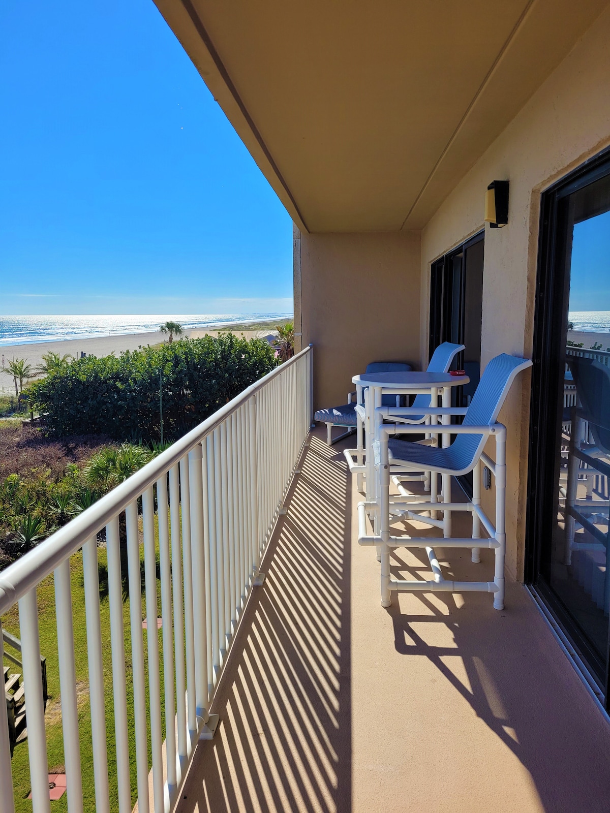 Savor Panoramic Ocean Views from the private balcony of this Beachfront second-floor condo. * Private beach access from backyard * Oceanfront balcony with comfortable seating * Convenient downtown Cocoa Beach location * Bedroom with King bed * Full kitchen with stainless steel appliances * 2 Smart TVs with cable * Free WiFi * Free assigned parking space * Full bathroom * In-unit washer and dryer * Full-sized foldout couch * Beach gear and towels * Complimentary toiletries, coffee and tea