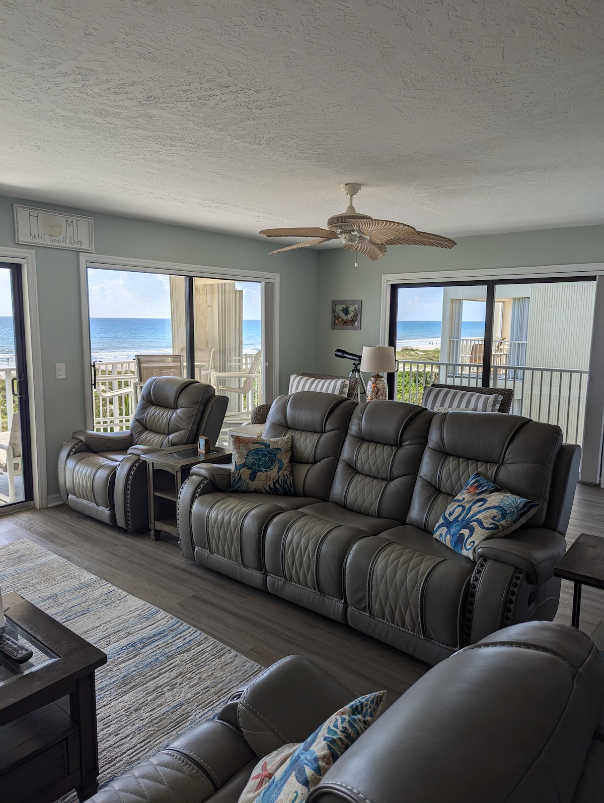 It's all about the view at our condo directly overlooking a beautiful, wide section of Cocoa Beach. There are expansive beach views from the living room, kitchen and master bedroom. This two bedroom, two bath condo is fully stocked for your stay. The complex has a heated pool and hot tub. Inside the condo, the master bedroom has a king size bed and the second bedroom is setup with two full beds. The master bath is en suite with a shower and the second bathroom has a shower/tub combo.