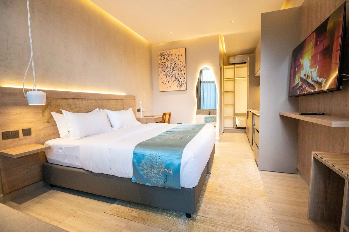 Indulge in our spacious King Suite at Light Villas Gigiri. Featuring modern décor, a plush king-size bed, and a dedicated work area. Enjoy natural light and city views. Amenities include high-speed Wi-Fi, smart TV, and an en-suite bathroom with premium toiletries. Access our gym, sauna, steam room, jacuzzi, and conference facilities. Located in Nairobi's prestigious Gigiri district, near the United Nations Office and Village Market.