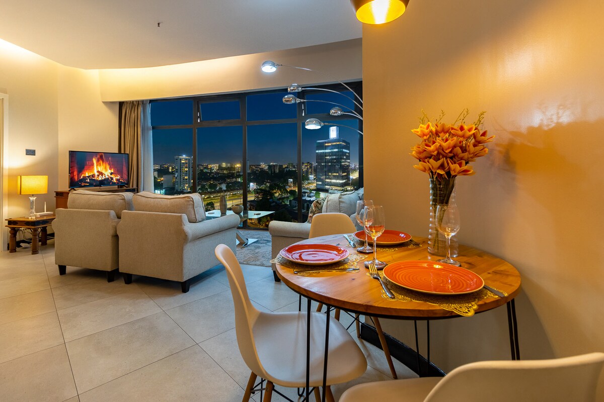 Welcome to the 17th-floor Bohemian Home in Kilimani. Here's what's on the menu: 🌅17th floor breath taking sunset view 🛒🛍️walking distance to Yaya Center 🛋️ private balcony comfort 🏋🏾♀️Fully equipped gym 🏌🏽♂️⛳️indoor golf 🏓Ping Pong 🚀Fast WIFI 🍿Netflix 💼Working space 🧑🏾🍳Turkish restaurant on the premises 💆🏾♂️💆♀️ Spa & Massage services on the rooftop 🎲 📚 Books and Games 🎨🪴Original art and plants ☕️Coffee maker 🍳fully equipped kitchen 🛌Cozy Chiropedic mattress 🧹Cleaning services at your convenience, & more…