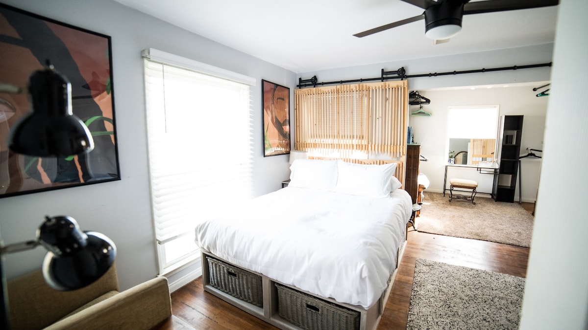 Our backhouse studio is truly a hidden gem in Los Angeles! Located in a peaceful neighborhood block with plenty of parking, best Asian food nearby and beaches at a 20min drive. Away from the noise and business of LA life but close enough to all the action and fun when needed. Designed to create two specific areas, a cozy living room and a stylish room with plenty of natural light, but also blackout curtains for better sleep. The entrance has french doors that open up to a small potted garden.