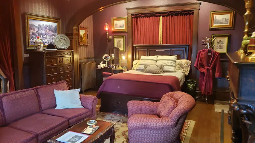The Studio is a luxury Stickley style queen suite, with kitchenette & private laundry facility. Access through the main grand stairwell or you own private second floor balcony entrance with table & chairs . Adjacent and private to your room is the original bath with large clawfoot soaking tub/shower and Tiffany windows. First floor common area features an elegant dining room & and 24/7 butlers pantry. Flat screen Roku t.v. wi-fi & free parking.