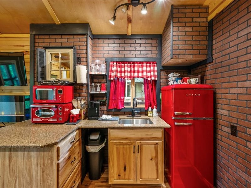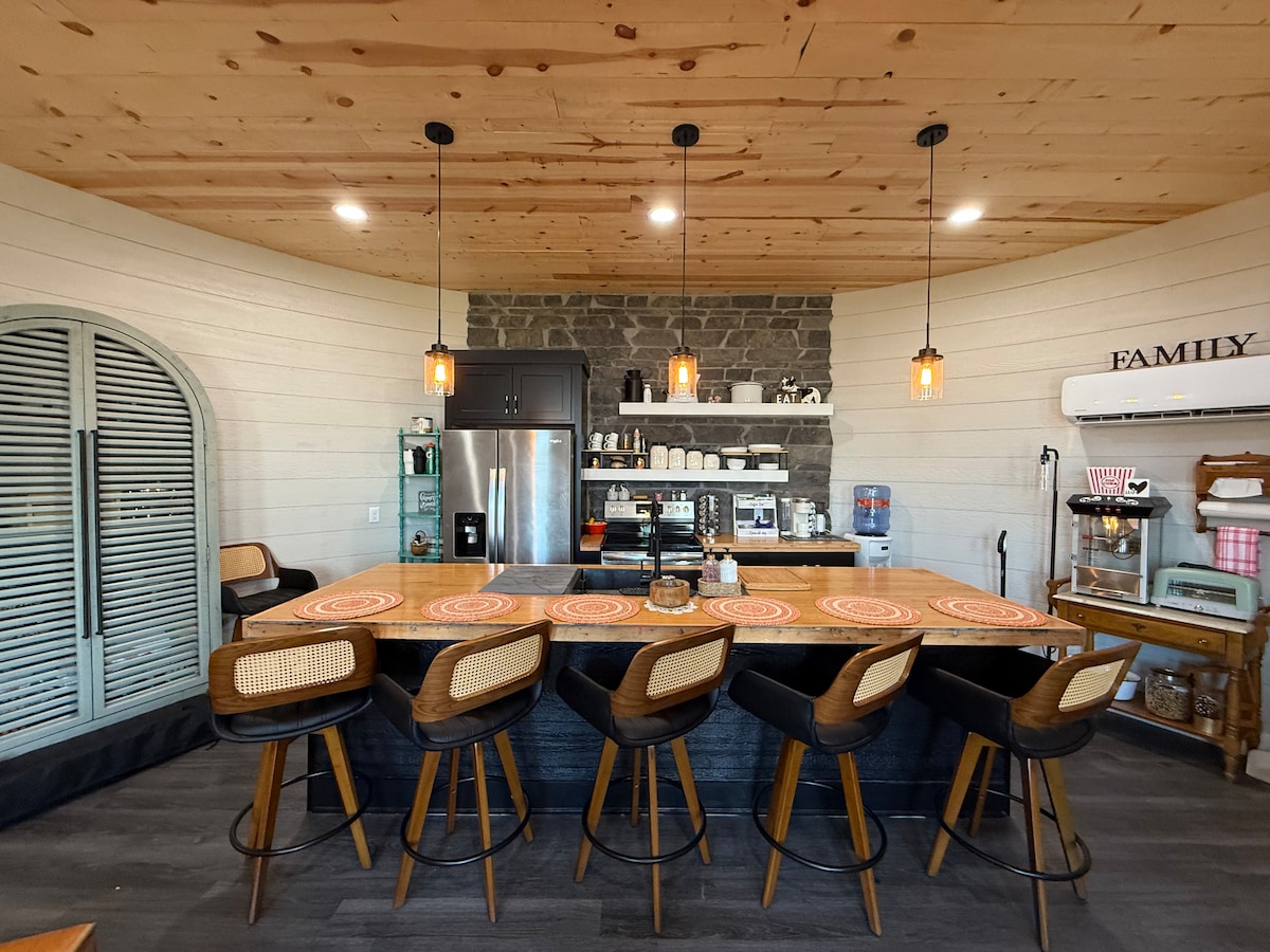 The perfect place to unwind! Master room boasts a super comfy king bed, a stylish built-in wall dresser, cozy fireplace, as well as a riverfront balcony. The Loft is great for lovers of Boho style, queen bed w/ ample space to stretch out for yoga as well as a private crow’s nest balcony! 3rd bed(twin) can be found in a repurposed library room. Take a dip in the jetted jacuzzi tub w/ a sunset view! A full kitchen awaits your cooking needs! Large private dressing/makeup room is a favorite!