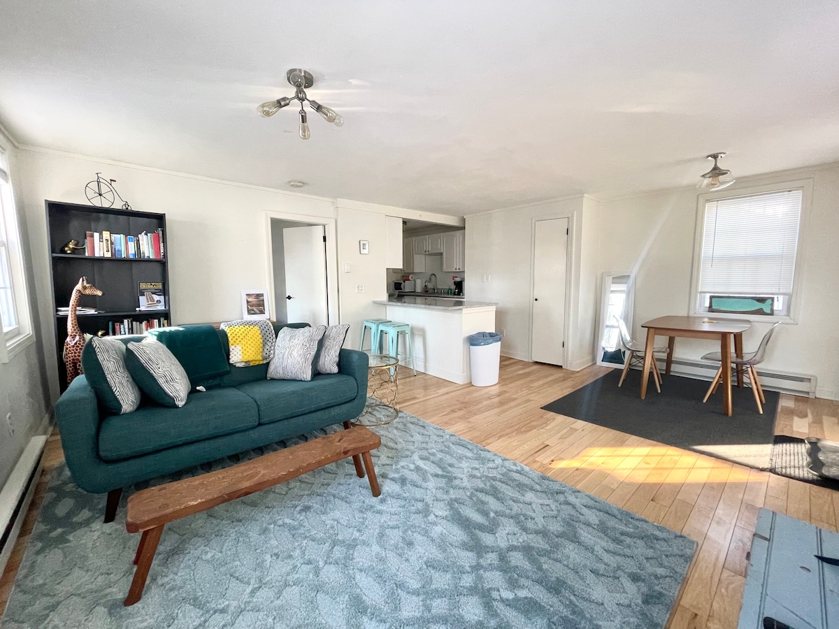 A lofted bed space with additional optional pull out couch fitted with ergonomic foam mattresses. This space has air conditioning as well as heat and amazing natural light. Brand new bathroom with rain shower head! A full kitchen with mini fridge, separate freezer space, oven, stove and coffee/tea supplies. Centrally located in Brunswick, and quiet! Right across from Bowdoin’s Whittier Field, and 10 minute walk to Maine Street.