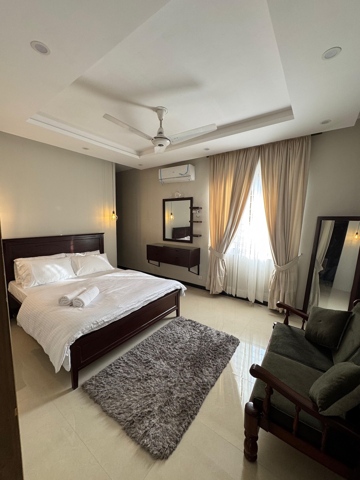 Modern, Cozy and Luxurious stay in Bahria Town Islamabad with Self-Check-in, Free Parking, Fast WiFi & Chromecast enabled TV. Enjoy a King Bed, Private Balcony with Views and Seating, Kitchenette (Fridge/Freezer, Microwave and Electric Kettle), and stocked Bathroom. Breakfast and Room Service available upon request and charges. In-house café and restaurant available. Prime location near parks, malls & restaurants, just 12-15 mins drive from DHA2 and Giga Mall and under 1 hour from the airport.
