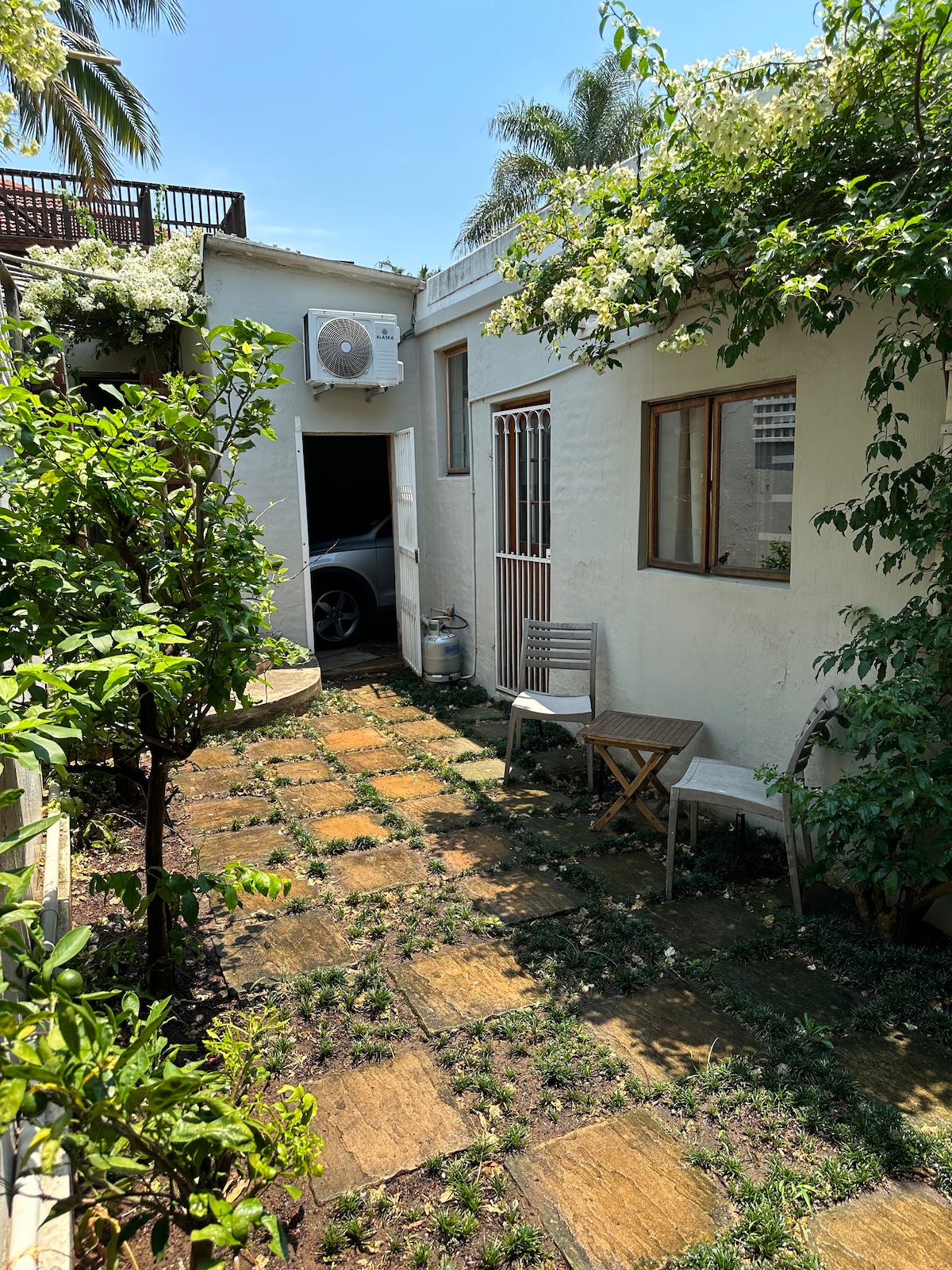 Private..Recently renovated. Parking garage (remote operated). Incredibly central for all activities in Durban (5 minutes to beach, stadium, Florida rd)…Walk to restaurants. Fully equipped kitchen, double bed with aircon, Wifi, tv with Disney+. Inverter for loadshedding. Solar powered geyser=amazing shower. Separate changeroom&workstation. Beautiful private outside area filled with fruit trees/shade. (For + 4 days: Room serviced every 4 days. Personal washing on request)