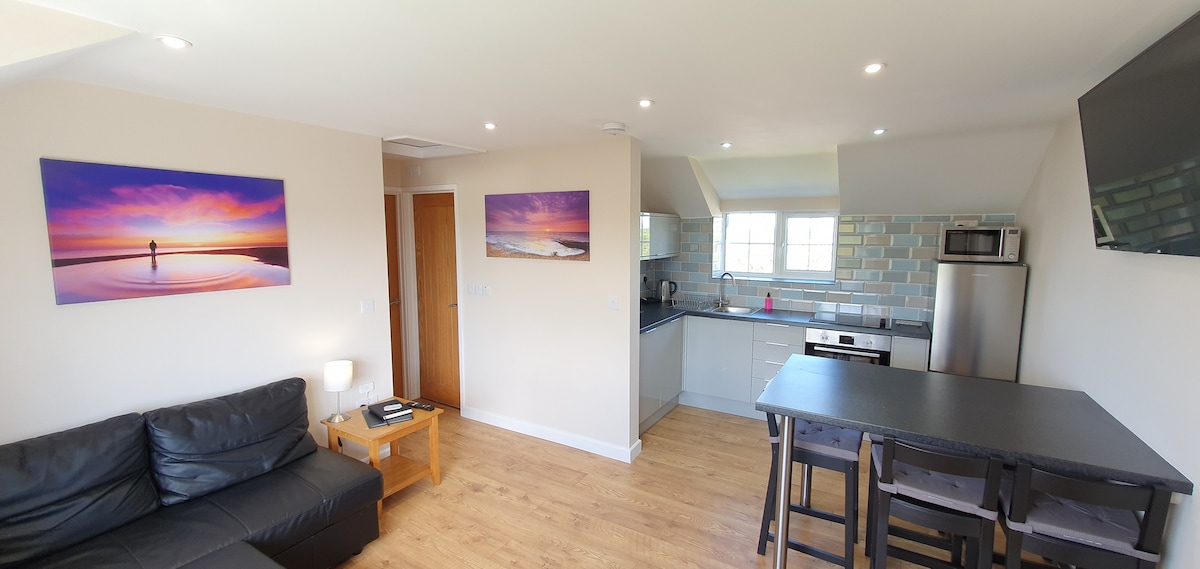 A beautiful, ground floor flat, located just footsteps from the glorious sandy beach of Westward Ho! This self contained apartment has a spacious open plan living area with dining table and well equipped kitchen. There is a double bedroom with ample storage and a sofa bed in the lounge area. The secure porch provides an useful storage space for surfboards, bikes, wetsuits and other outdoor equipment. The property is south facing and enjoys its own off-road parking.