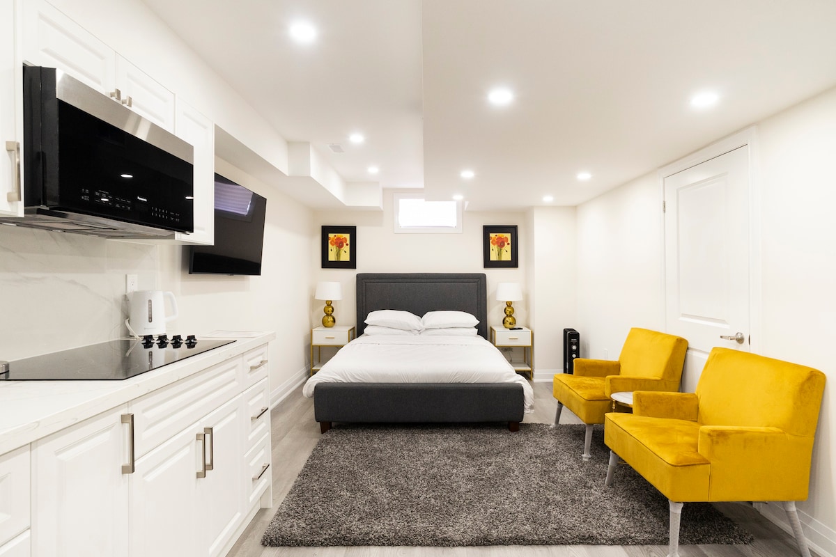 Cozy, bright, furnished basement studio with high ceilings and private entrance. Ideal for short-term visitors at Sheppr/Bathurst area. This place includes a small kitchen, in-suite washer/dryer, full bath, TV, and Bell 5G internet. Netflix and Prime streaming available. Great location: 10 min to Hwy 401, groceries, restaurants, and Subway to Downtown, Pearson Airport, and and a 5-min ride to Rogers Stadium . Quiet, smoke-free, pet-free home. Loud and late-night party is not welcome!