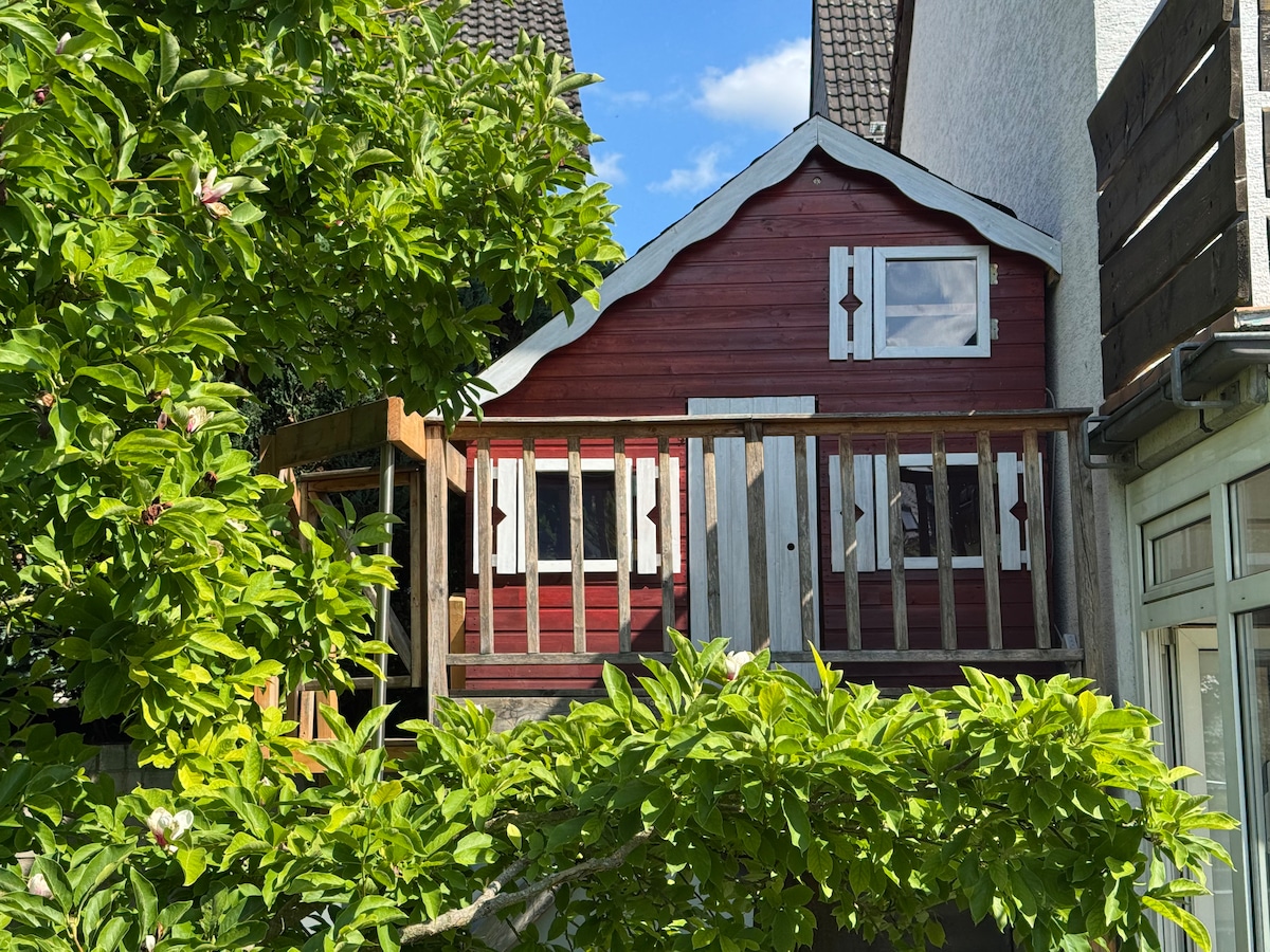 Genieße ein Aufenthalt im Gartenhäuschen im Grünen mit Blick über die Felder auf die Frankfurter Skyline. Das Häuschen bietet ein kleine Küchenzeile mit einem Kochfeld und Kühlschrank, ein Badezimmer mit Dusche, Waschbecken und WC. Ein gemütlicher Esstisch, ein kleines Sofa und eine Terrasse laden zum Verweilen ein. Die Leiter hoch geht es in das Obergeschoss mit Bett (2 Matratzen a 80cm Breite) und Kleiderschrank. Fotos von dort folgen, sobald meine Tochter das Zimmer geräumt hat.