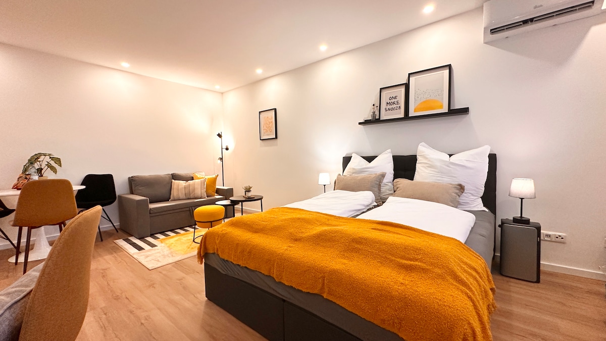 Enjoy a stylish experience at this centrally-located property. Loft like design, fully equipped kitchen, cozy stylish bedroom with a comfortable queen sized bed (river view from the window), fast speed Wi-Fi (well adapted for work from home). Free parking on all the streets around the building. Direct public transport connection to the airport, Messe (exhibition center) and central station (Hbf). Sleeps up to 3 people (there is an additional payment if you want to use the sofa for sleeping)