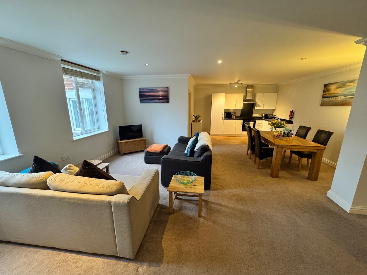 A brand new apartment just 50 steps from the beach with free parking in the heart of Weymouth directly on the Esplanade with panoramic sea views of the award winning beach. Well equipped and nestled amongst shops and restaurants . Just minutes walk to bars , the harbour and train station. Fully fitted kitchen with family size fridge freezer, oven, microwave, toaster, kettle, cutlery, crockery, dishwasher, washing machine, flat screen TV's, Wifi, Hand, bath and beach towels provided.