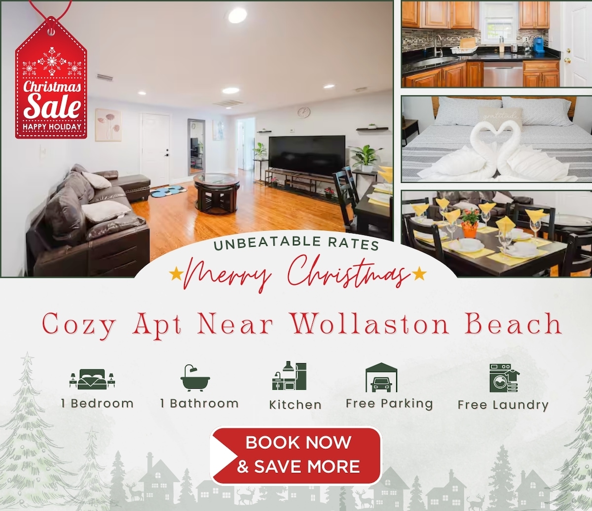 Enjoy a comfortable stay in this private entrance, beautiful, newly renovated 1 bedroom apartment only a short 4 minute walk to Wollaston train station- 5 stops to downtown Boston. Convenient access to Boston by car (15-20min) as well. Full gut-renovation, open floor kitchen/dining room. Gorgeous bathroom. New HVAC system. W&D in unit. Off street parking spot right next to separate, private entrance. Great neighborhood, beautiful park across the street.